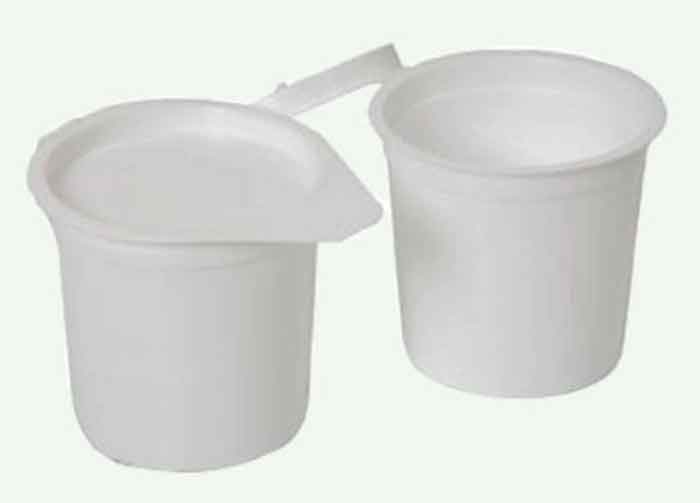 Gobelet à usage unique monobloc avec couvercle rigide rattaché destiné à recueillir les expectorations (crachats).