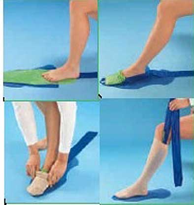 Glissez le bas de contention, avec le VenoTrain glider, au dessus de votre pied et vers le haut ( en commençant, comme d’habitude par la pointe).