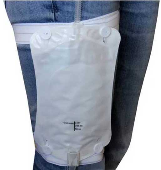 Les poches à urine de jambe Conveen se raccordent aux étuis péniens ou aux sondes urinaires et se fixent sur la jambe pour permettre des déplacements en toute sécurité lors de la journée.