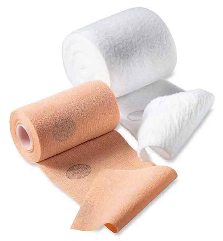 - Bande cohésive à allongement long, maintenant le bandage en place et apportant la pression additionnelle nécessaire pour atteindre la pression thérapeutique.