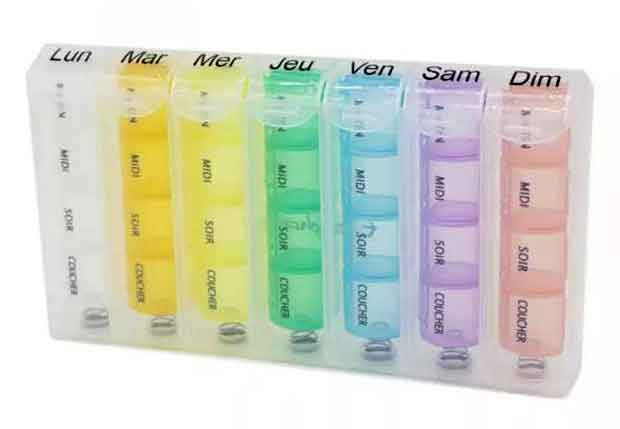 7 modules de 4 compartiments (matin, midi, soir, coucher).