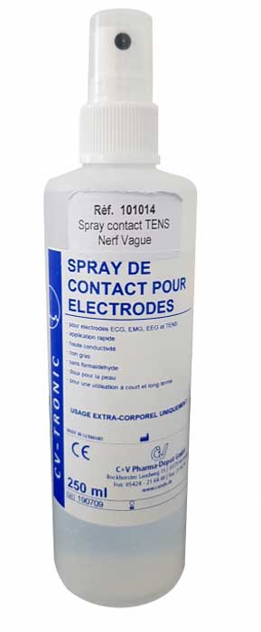 Mentions obligatoires Dénomination : Spray de contact TENS pour électrode auriculaire Destination : Pour électrode auriculaire de stimulation du nerf vagueFabricant : Schwa MedicoInstructions : Lire attentivement la notice Ce dispositif médical est un produit de santé réglementé qui porte, au titre de cette réglementation, le marquage CE.