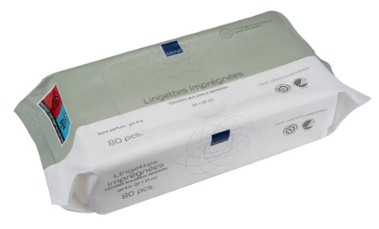 Lingettes imprégnées laissant la peau douce et hydratée.