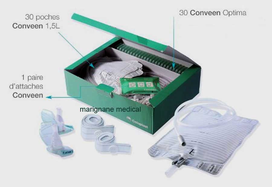 Dénomination : Etuis péniens,poches à urine Conveen Duo Optima SpecificDestination : Pour l’incontinence urinaire masculine.Fabricant : ColoplastInstructions : Lire attentivement la noticePrudence : En cas de doute, consultez votre médecin ou un professionnel de santé.Ce dispositif médical est un produit de santé réglementé qui porte, au titre de cette réglementation, le marquage CE