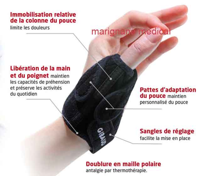 Immobilisation relative de la colonne du pouce : limite les douleurs.