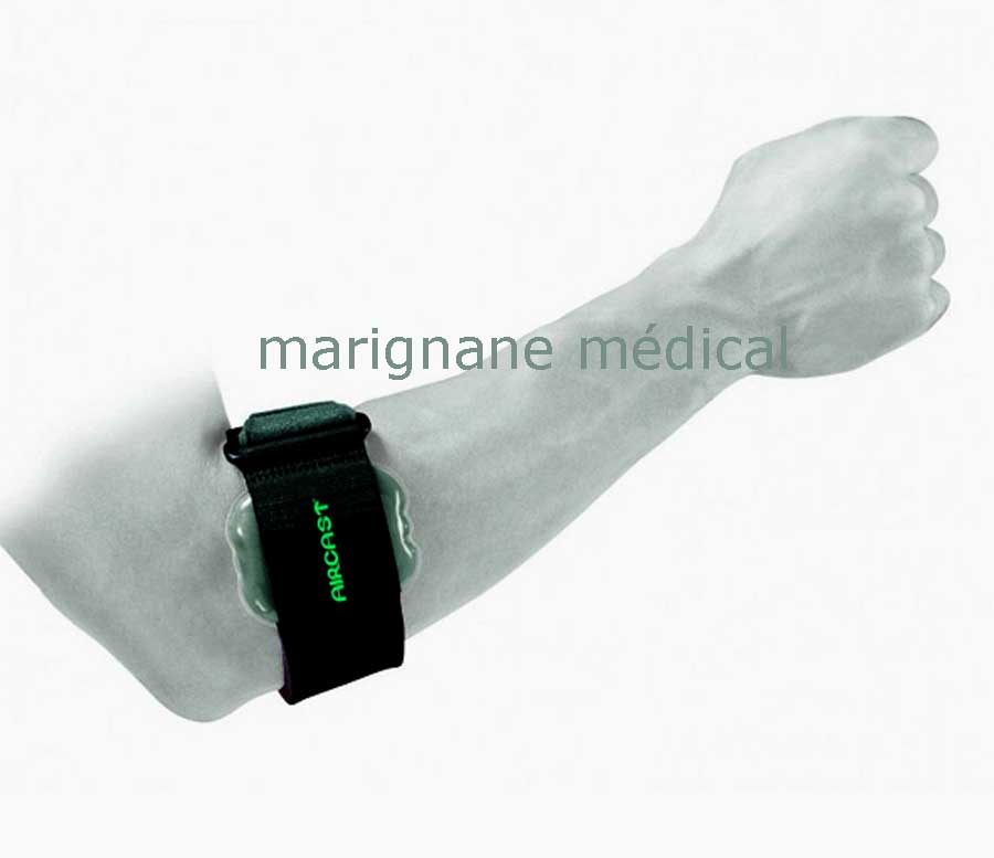 Le bandage Aircast est un bracelet épicondylien muni d'une cellule pneumatique exerçant une compression localisée sur le tendon commun des muscles épicondyliens et non pas sur la circonférence de l'avant-bras.
