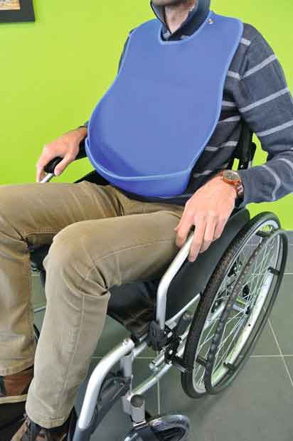 Le bavoir imperméable en néoprène est un accessoire destiné aux personnes adultes en situation de handicap éprouvant des difficultés à manger.
